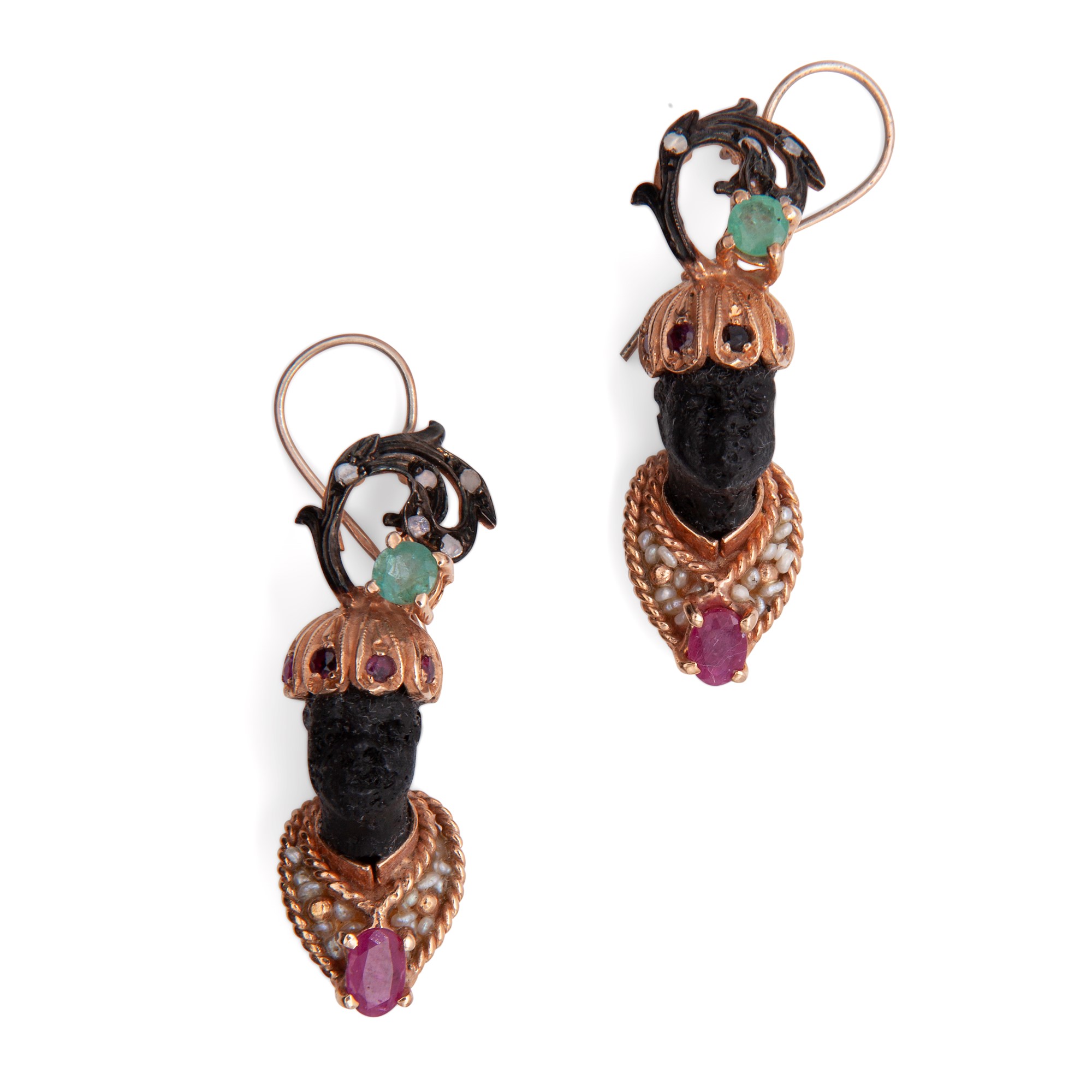 Orecchini moretto in ebano, oro e argento, diamanti, smeraldi, rubini e microperle.