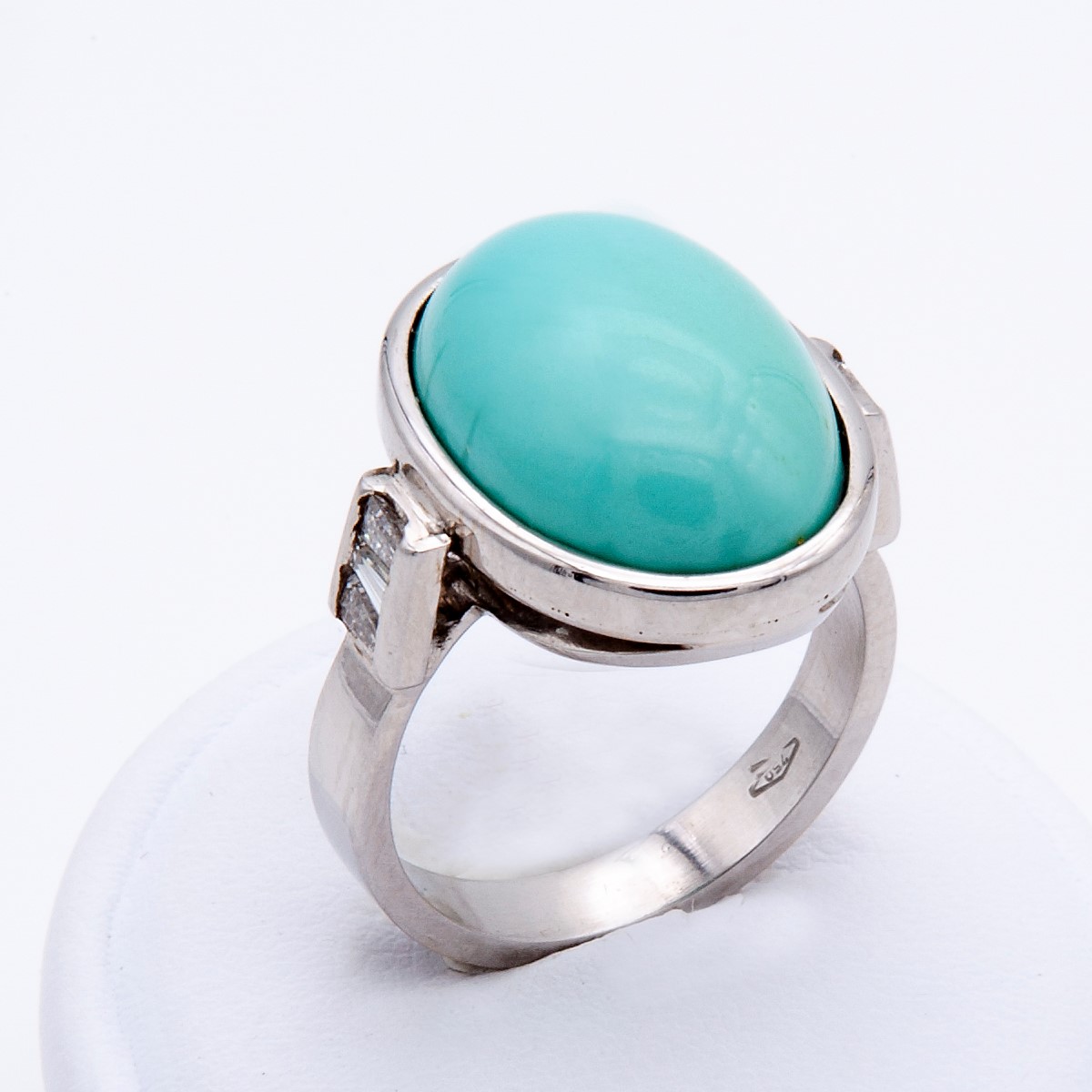 Oro bianco 750/000. Spola di turchese stabilizzato e diamanti in taglio baguettes. Peso complessivo gr. 9,90.