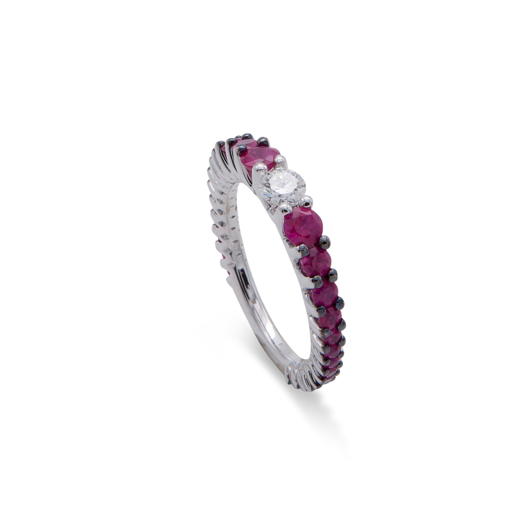 Oro bianco 750/000 diamante ct 0,20 circa, prob. H - VVS, rubini in taglio rotondo.