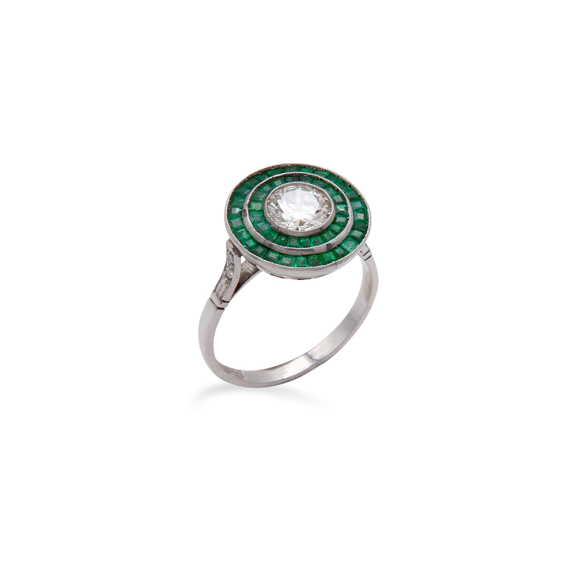 Platino 950/000, brillante centrale ct.0,70 ca. J, VS, smeraldi in taglio calibrè.
