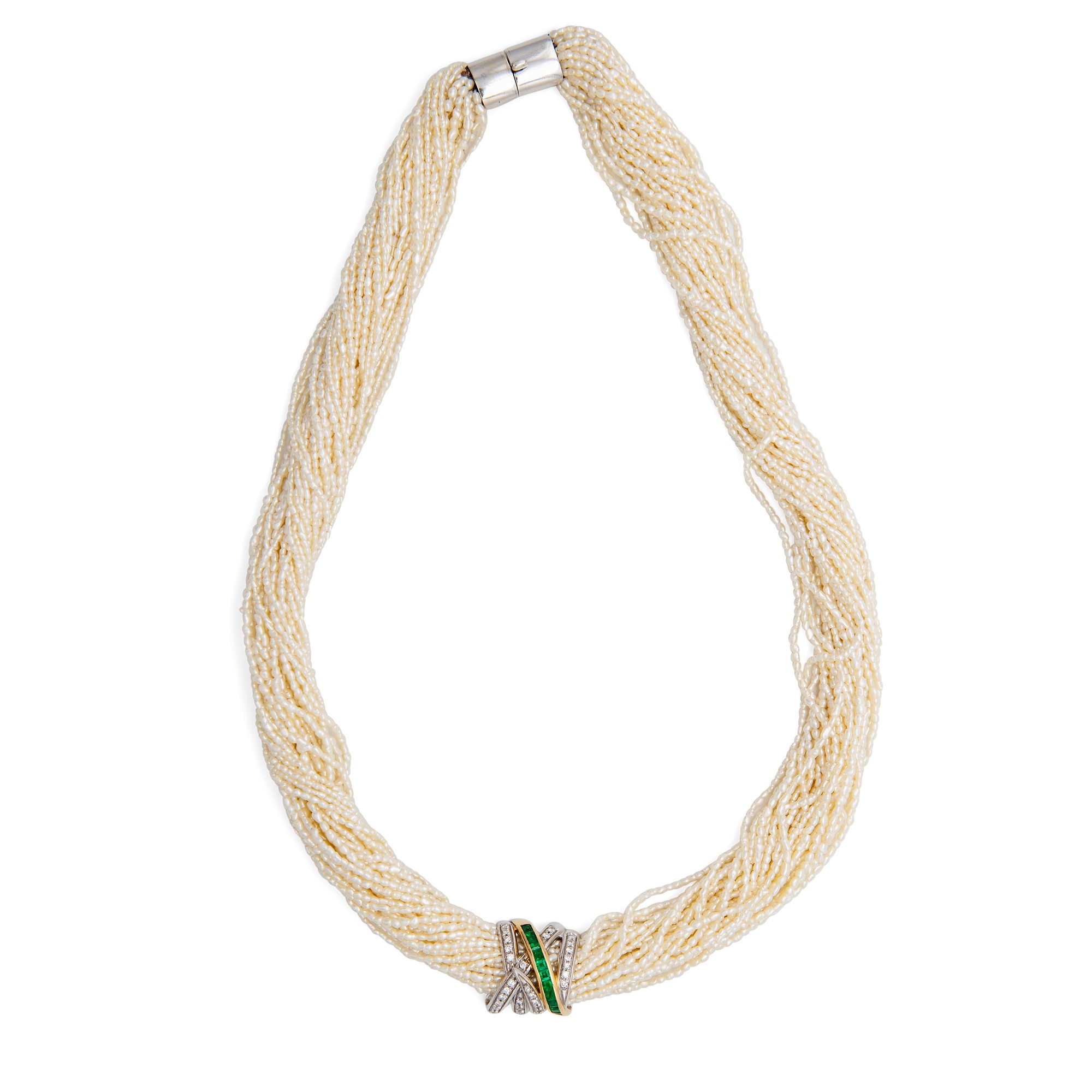Alfieri st. John, collana in microperle, oro ,brillanti e smeraldi