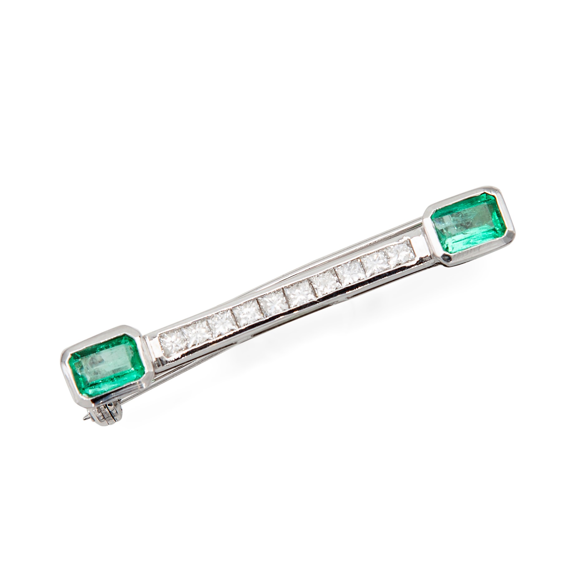 Spilla a barretta in oro,smeraldi e diamanti taglio princess