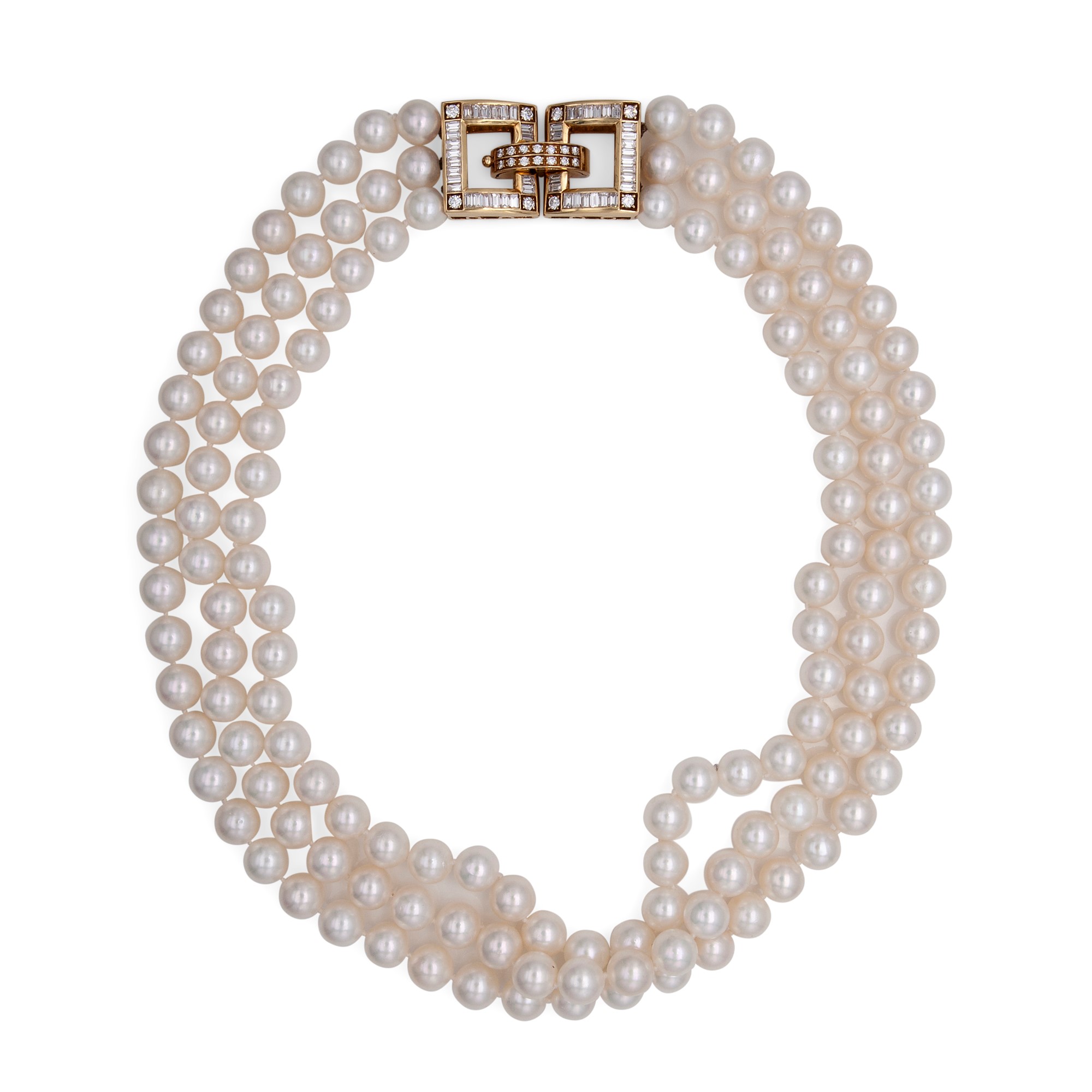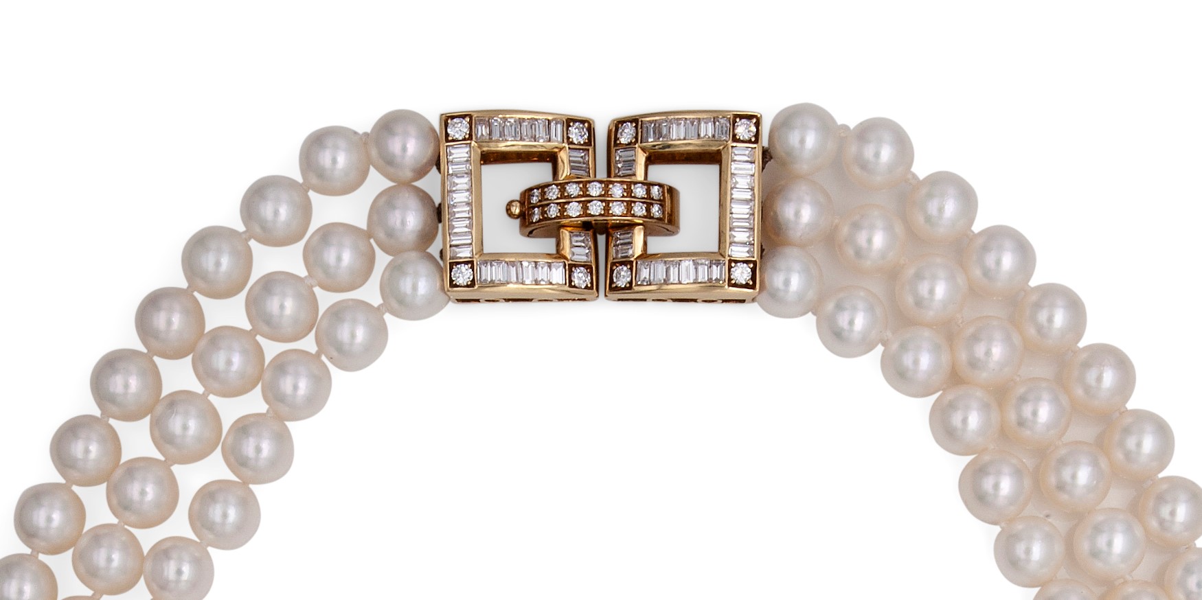 Oro giallo 750/000, diamanti in taglio brillante rotondo e baguettes, ct. 5,50 ca. prob F/G - VVS. Perle mm 9.