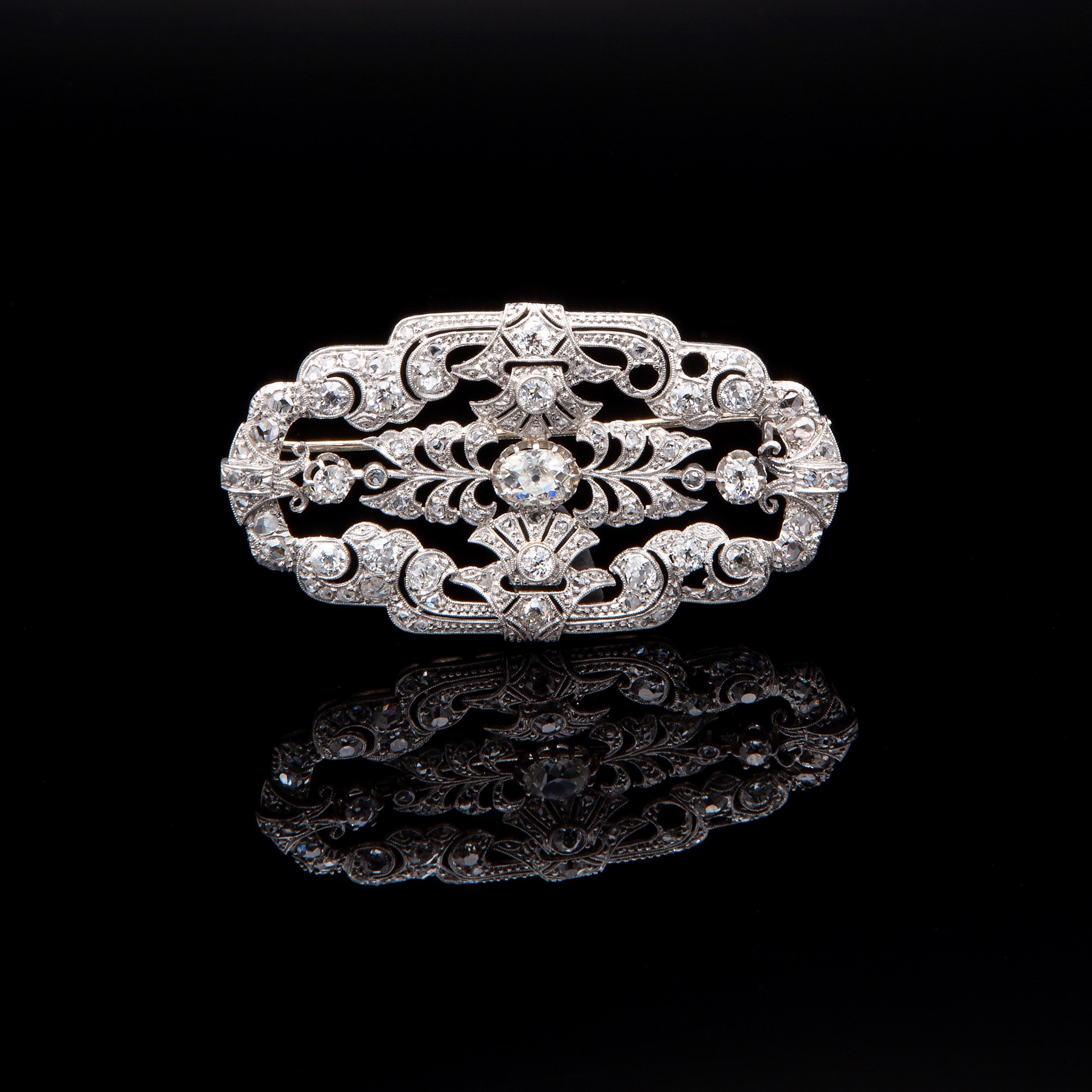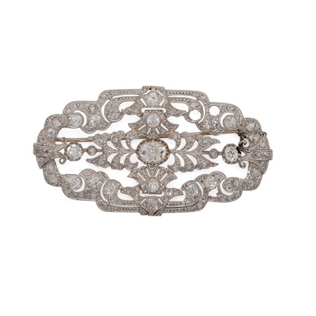 Spilla 1920/1930, oro bianco 750/000. Diamanti in taglio vecchia Europa, ct 2,80 ca. Mancanza di tre brillanti. Peso complessivo gr 13,20.