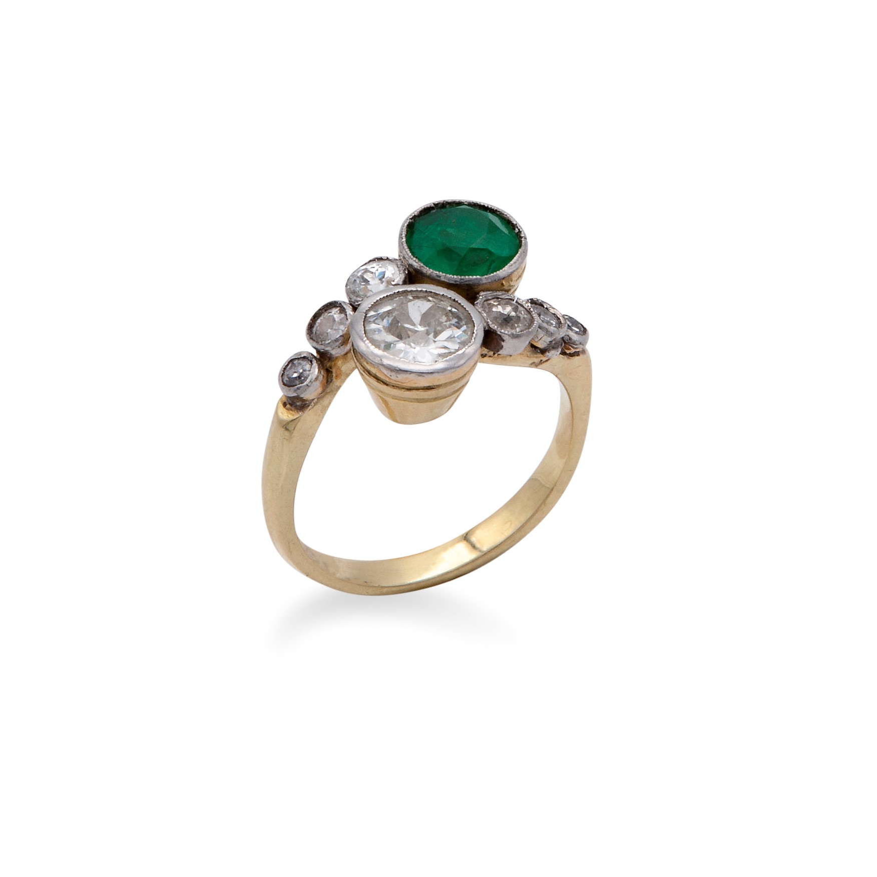 Anello contrariè in oro degli anni '30 brillanti e smeraldo