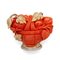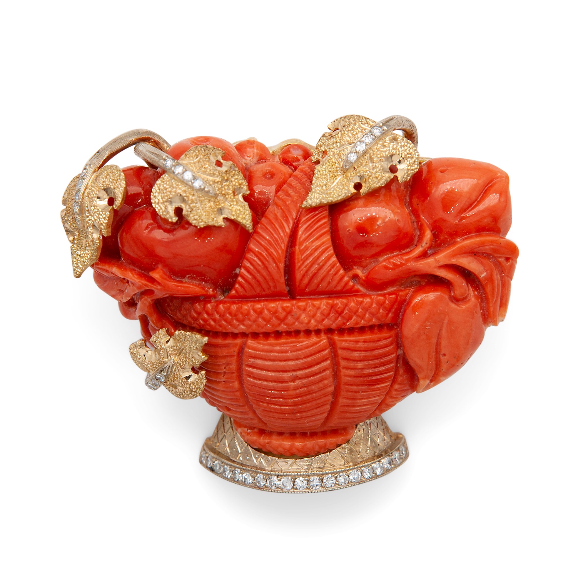 Oro giallo 750/000, elemento centrale in corallo cerasuolo in blocco scolpito, brillanti, peso complessivo gr. 35,10.