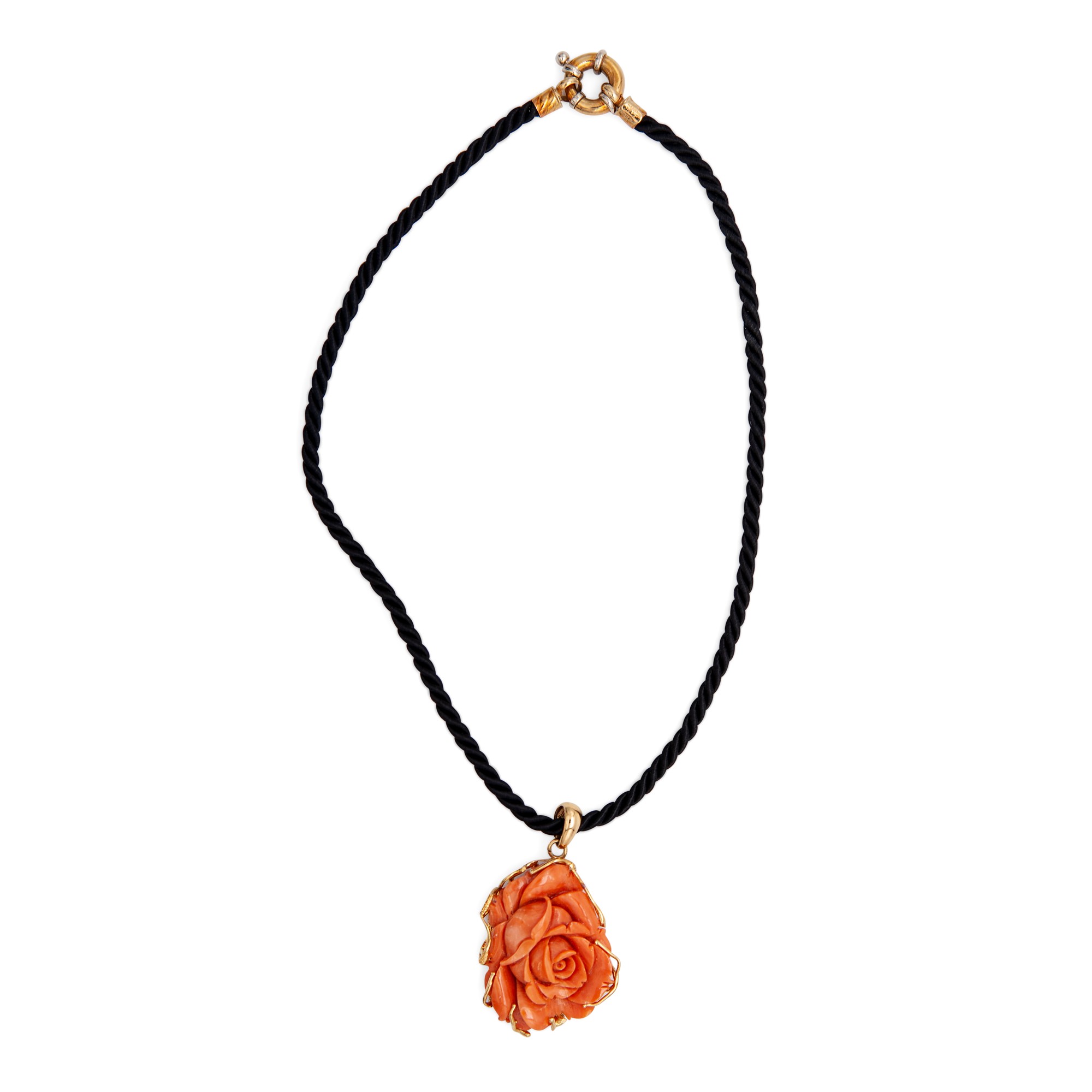 Oro giallo 750/000, corallo cerasuolo scolpito in tema floreale.
