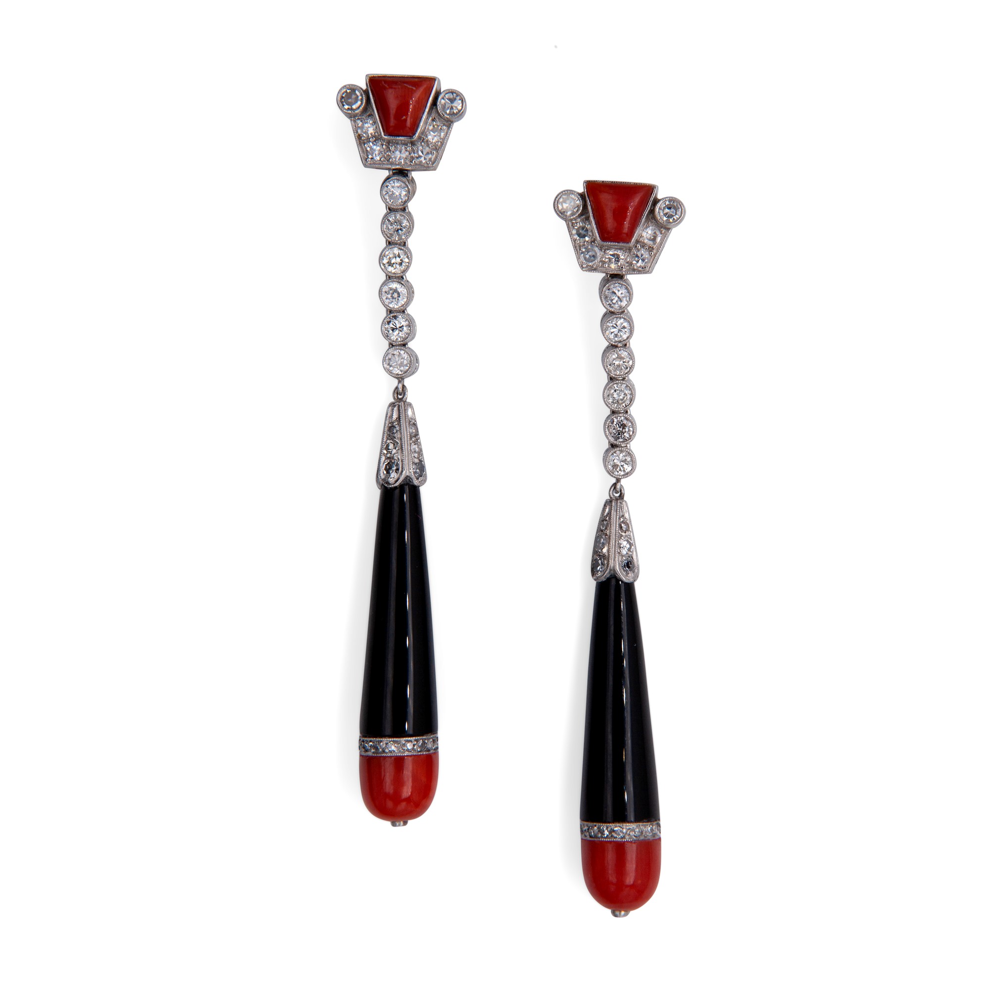 Coppia di orecchini pendenti del periodo art decò in platino, brillanti, corallo e onice