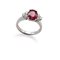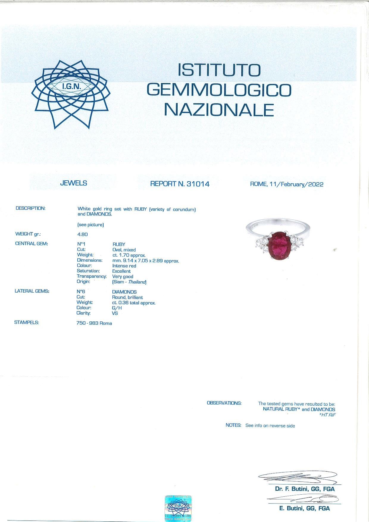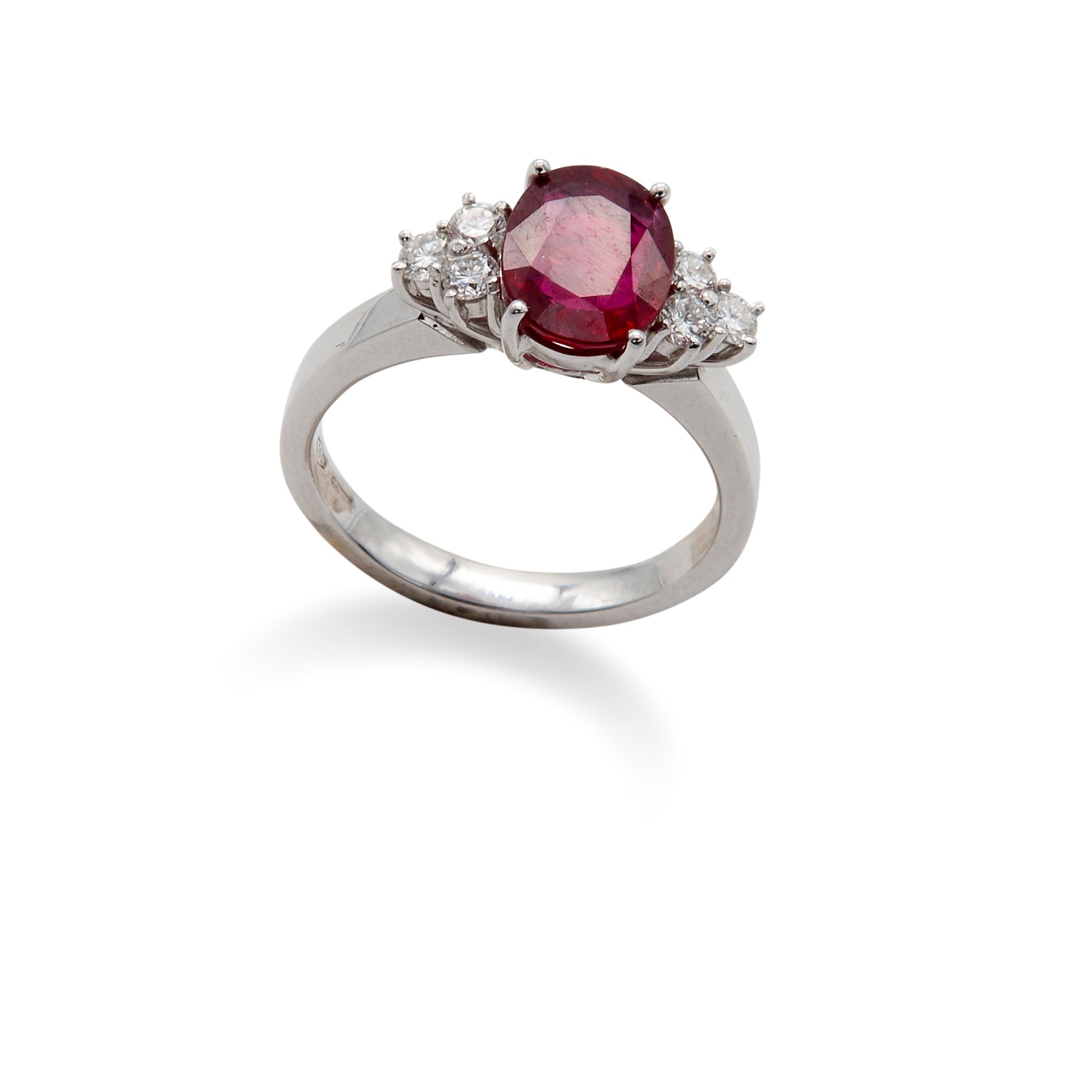 Oro bianco 750/000. Rubino naturale in taglio ovale ct. 1,70, brillanti ct. 0,36 G/H,VS. Corredato di certificazione gemmologica.