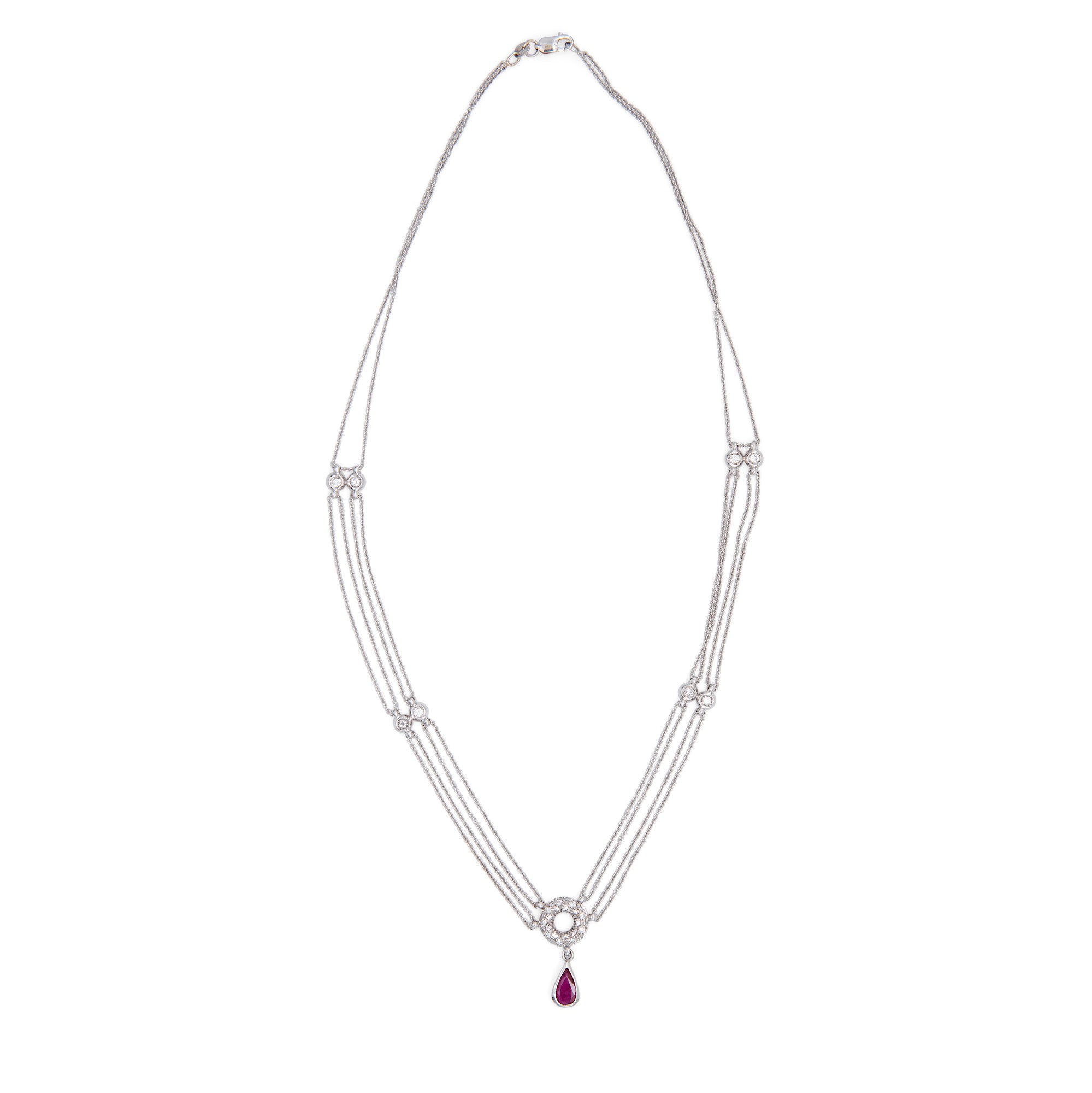 Oro bianco 750/000, brillanti e rubino in taglio goccia.