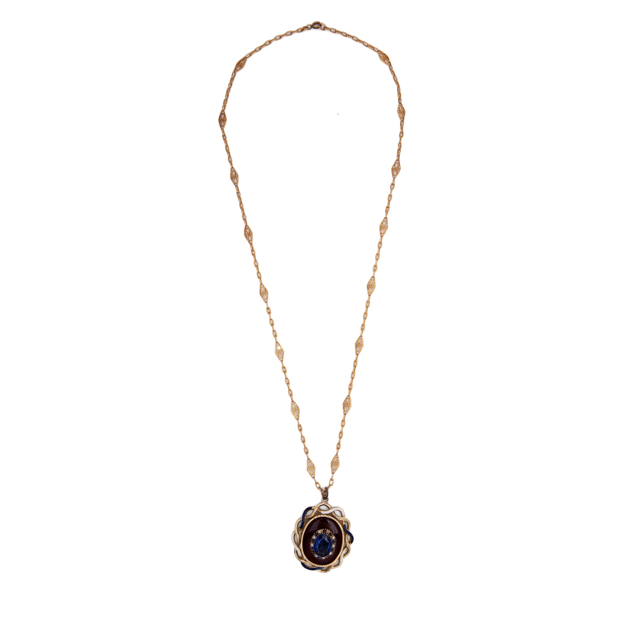 Oro giallo 750/000, corniola centrale, zaffiro in sintesi e microperle. Catena cm 60. Peso complessivo gr. 29,30.