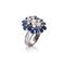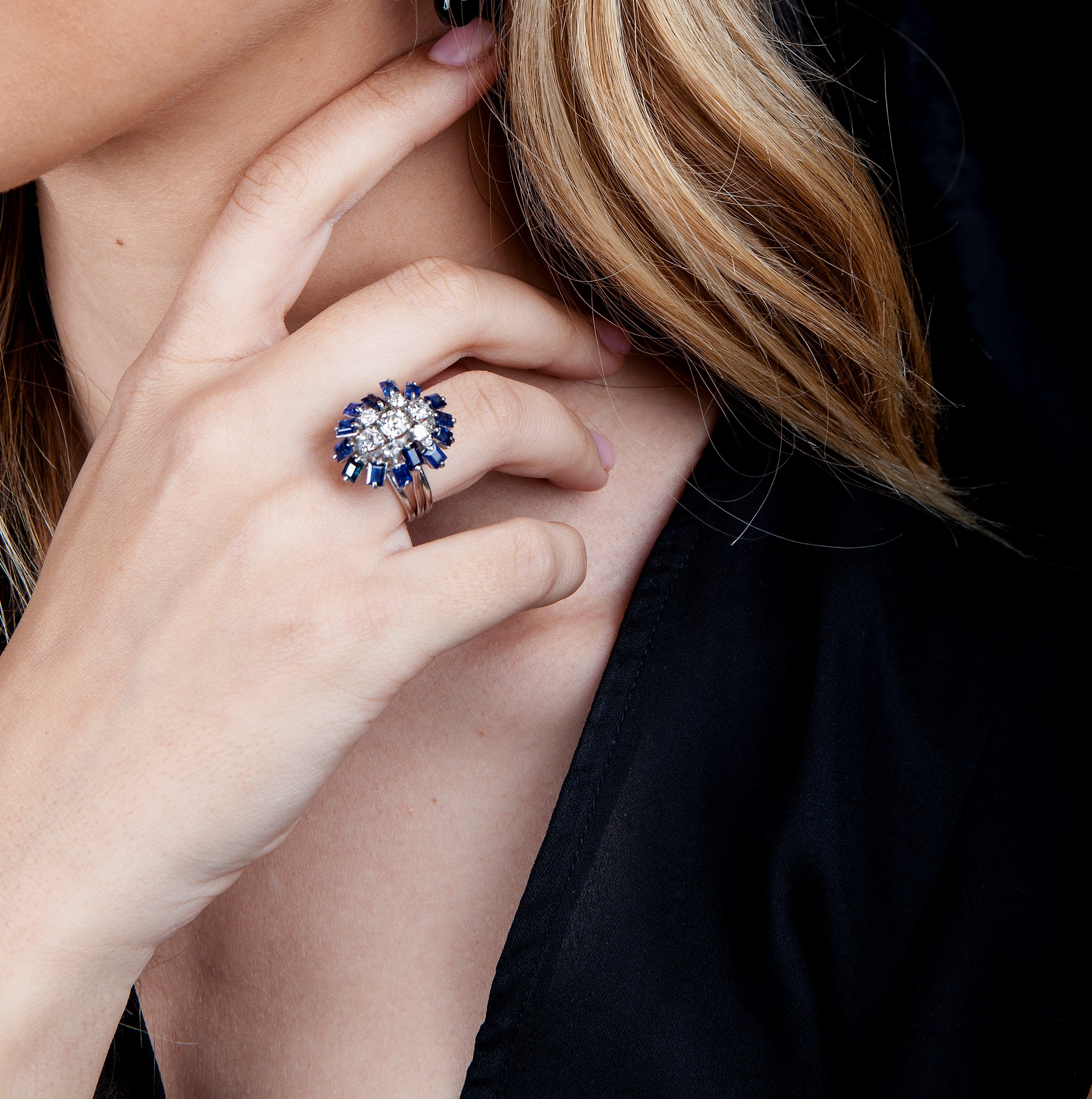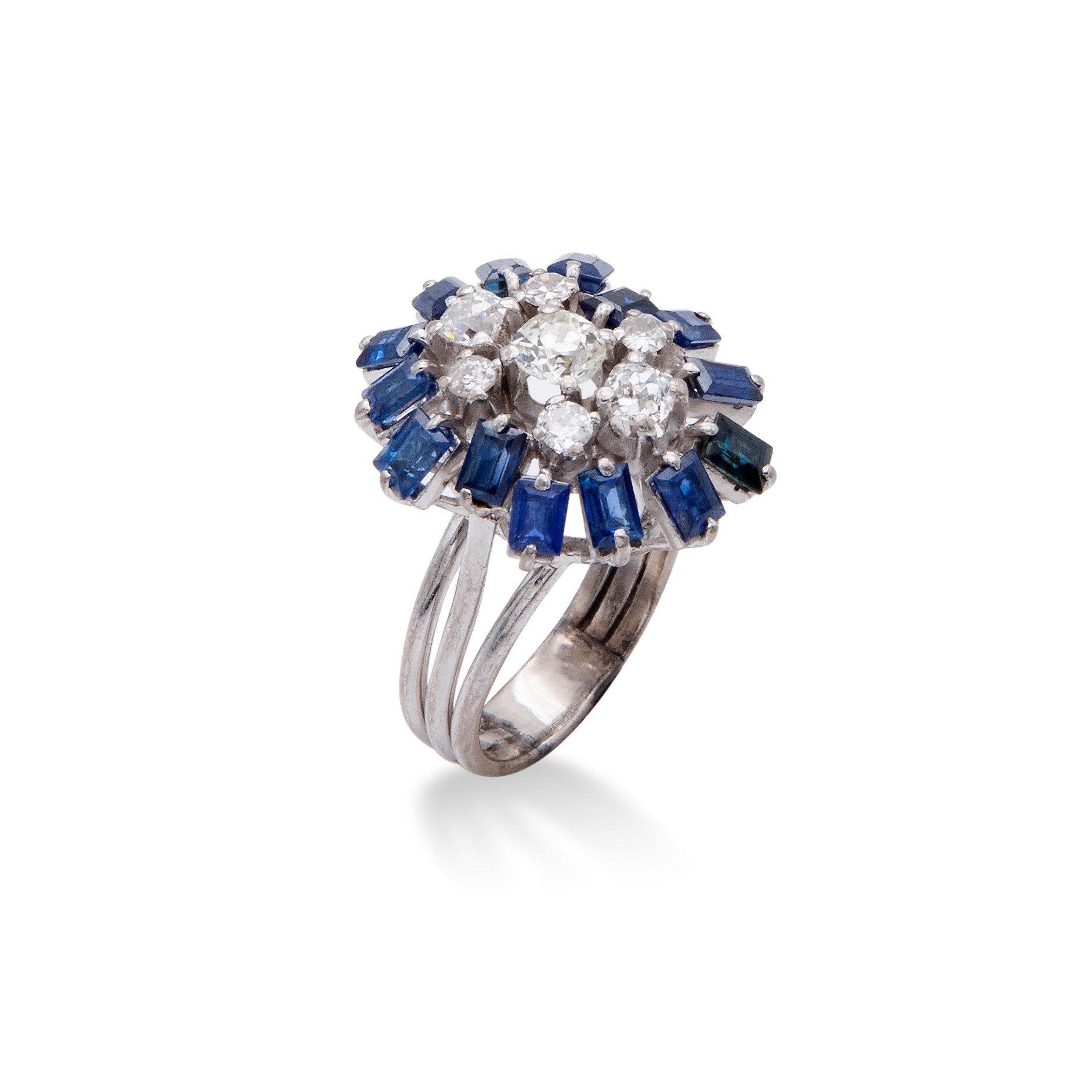 Oro bianco 750/000, diamanti taglio old mine ct 0,70 ca. e zaffiri taglio baguettes. Peso complessivo gr 11,40.