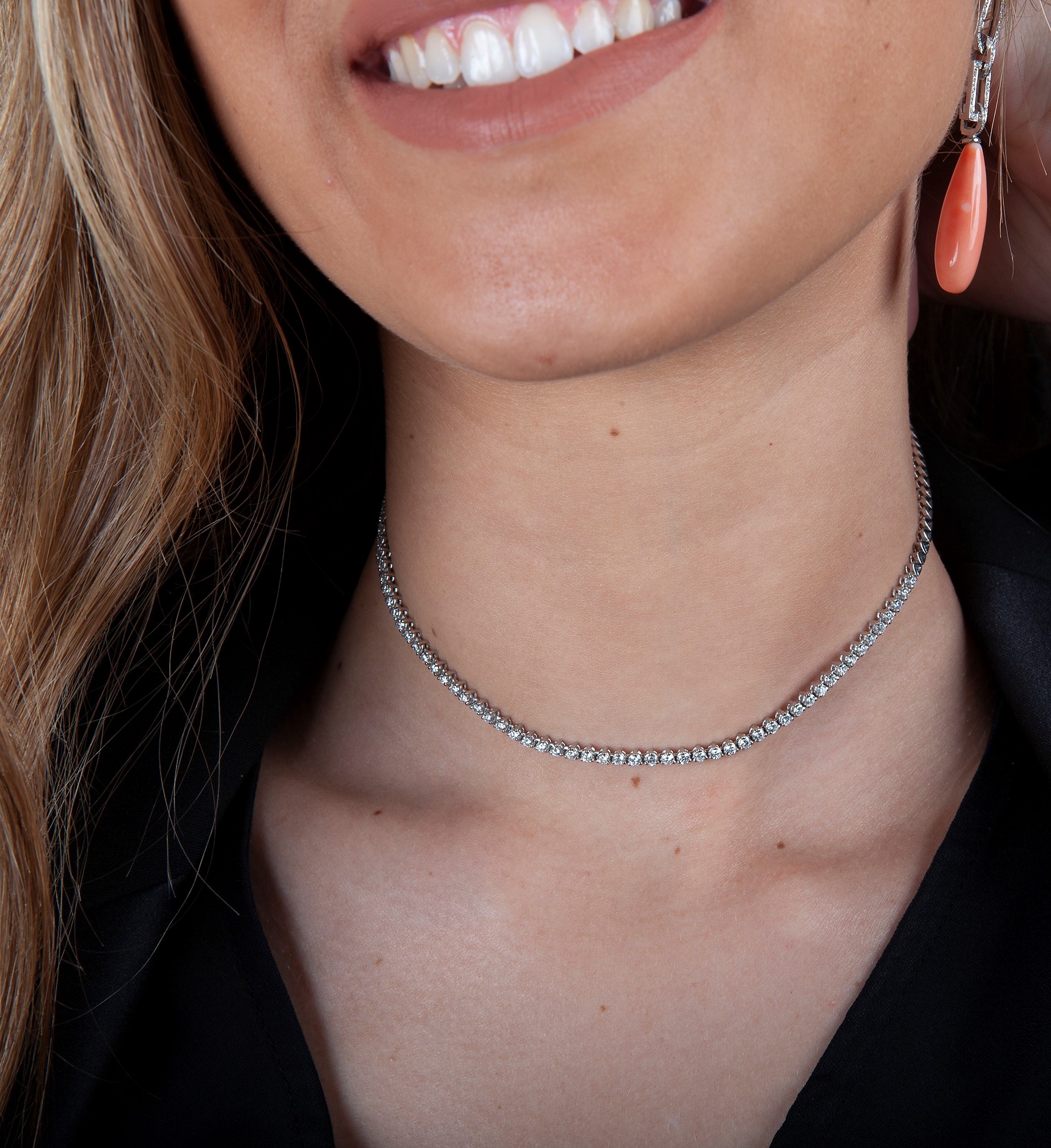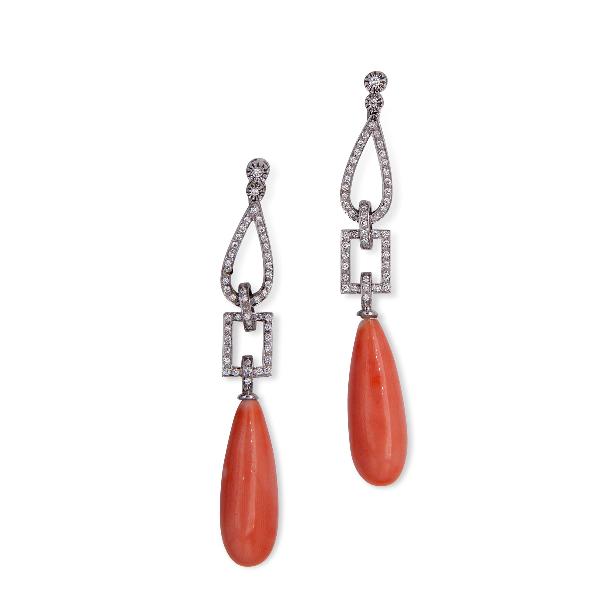 Oro bianco 750/000, brillanti ct. 1,20 ca, goccia in corallo cerasuolo. Peso complessivo gr 13.