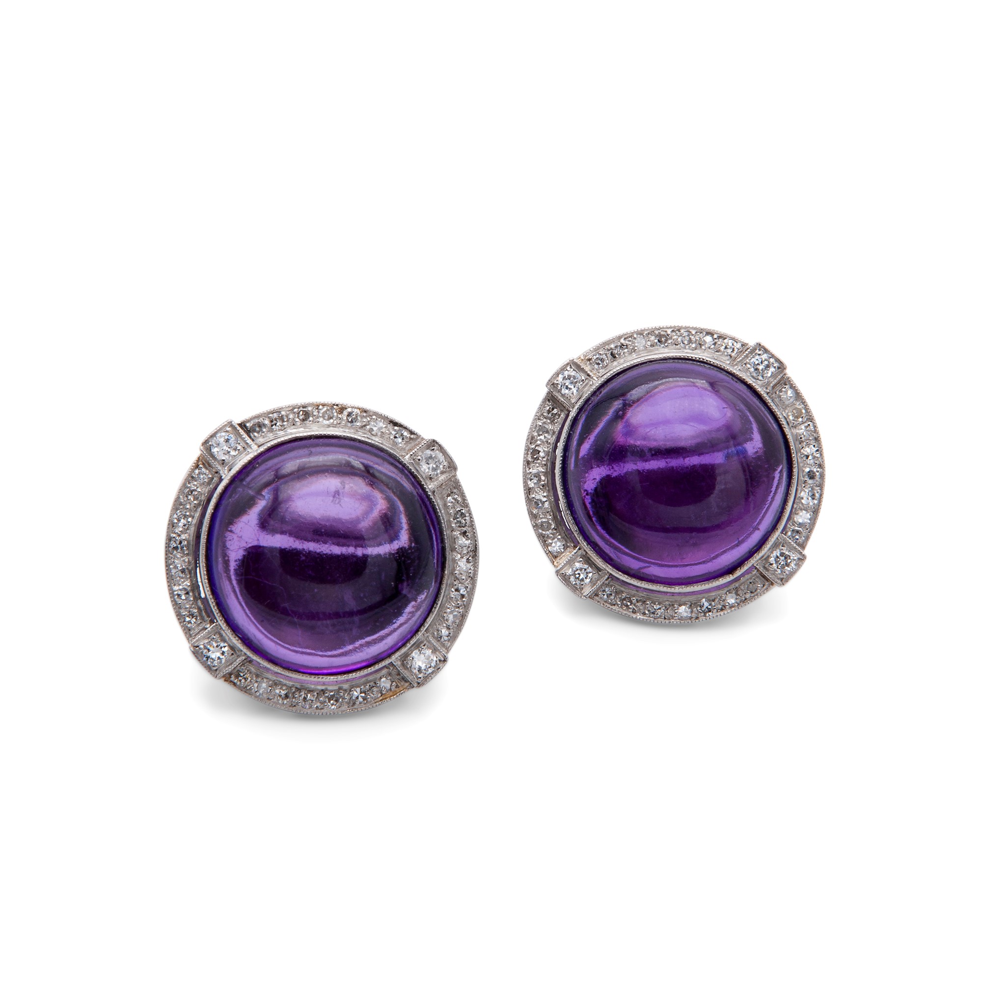 Coppia di orecchini a lobo anni '30 in oro ametiste e brillanti