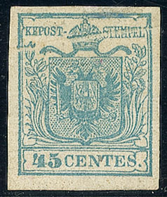 ANTICHI STATI - Lombardo Veneto - 1850 - 45 cent - pliè d’accordeon diagonale in alto - grinza orizzontale di gomma con lieve sfaldatura - Diena + cert. Chiavarello (10c - 32.000)