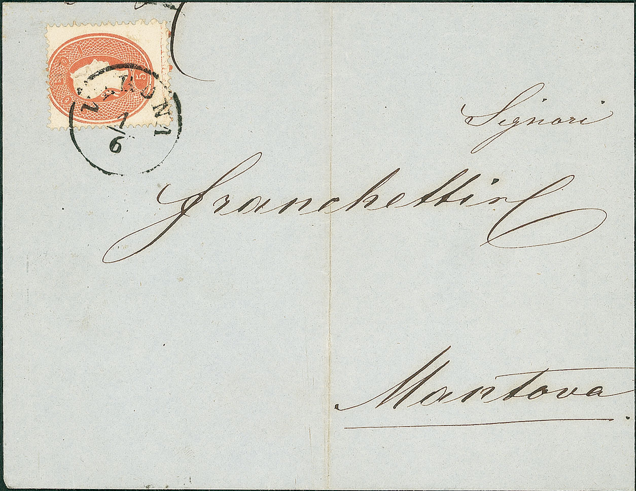 ANTICHI STATI - Lombardo Veneto - 5 soldi - dentellatura orizzontale spostata con parti dell’inquadratura colorata in basso - involucro di lettera da Verona a Mantova (33e)