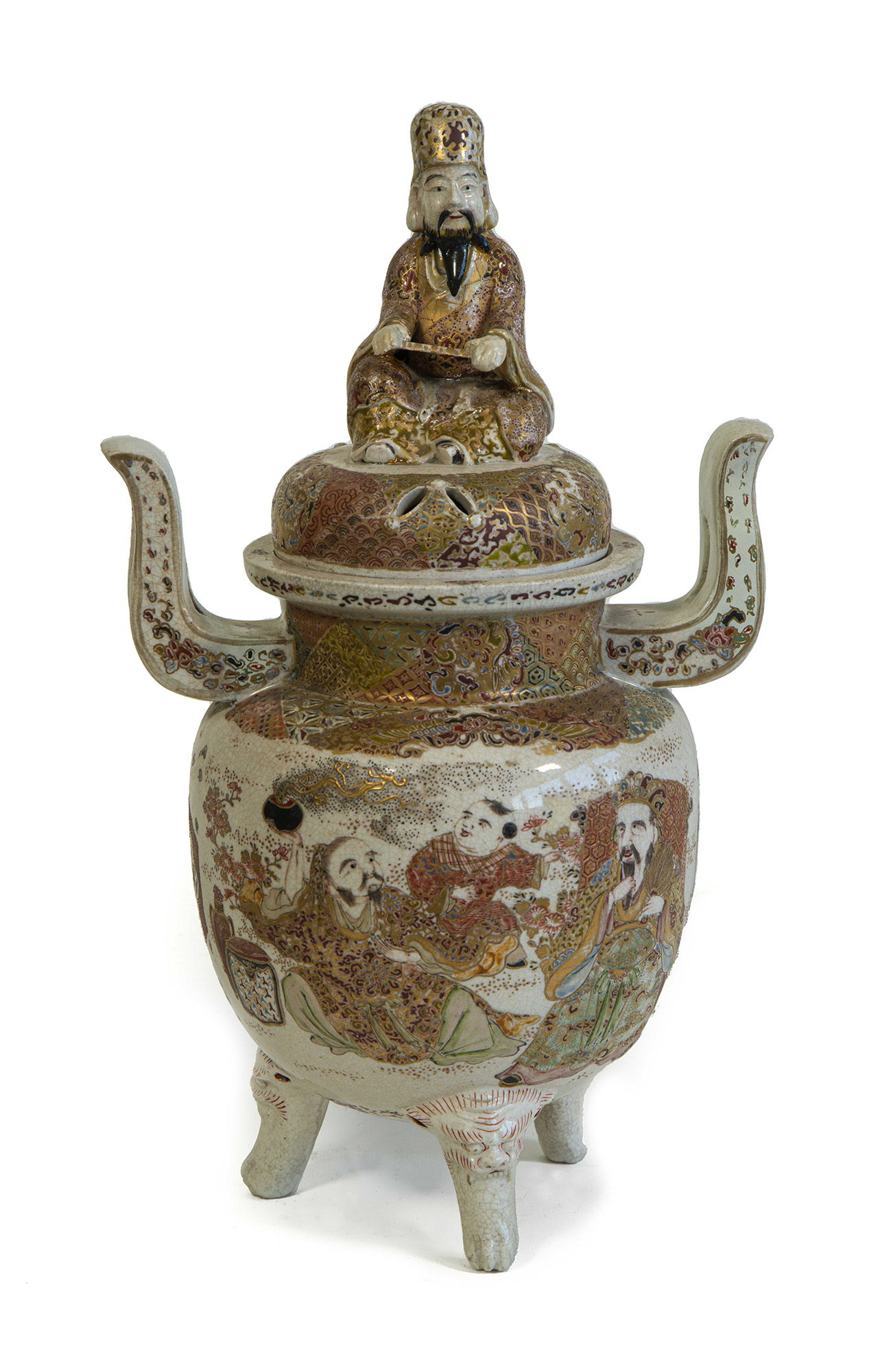 Incensiere in ceramica Satsuma con dignitario sul coperchio
