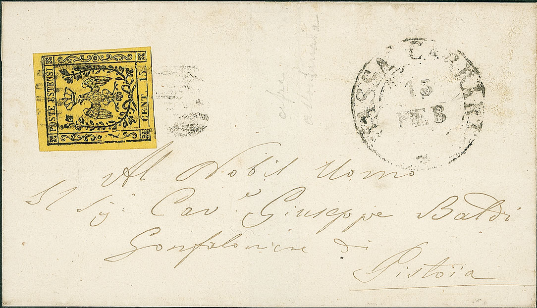 ANTICHI STATI - Modena - 15 cent - cent molto distanziato dal 15 - involucro di letterina da Massa a Pistoia (3)