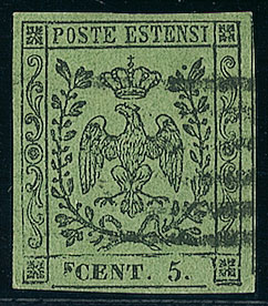 ANTICHI STATI - Modena - 1852 - 5 cent - impronta di spazio tipografico a sinistra di cent (8)