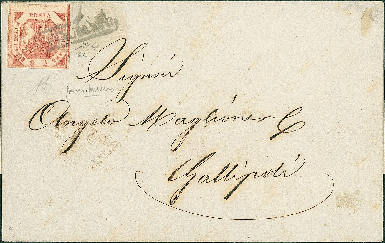 ANTICHI STATI - Napoli - 2 grana - stampa smossa con effetto doppia incisione del valore - lettera da Napoli a Gallipoli del 28.8.58 - Diena + Chiavarello (6c)