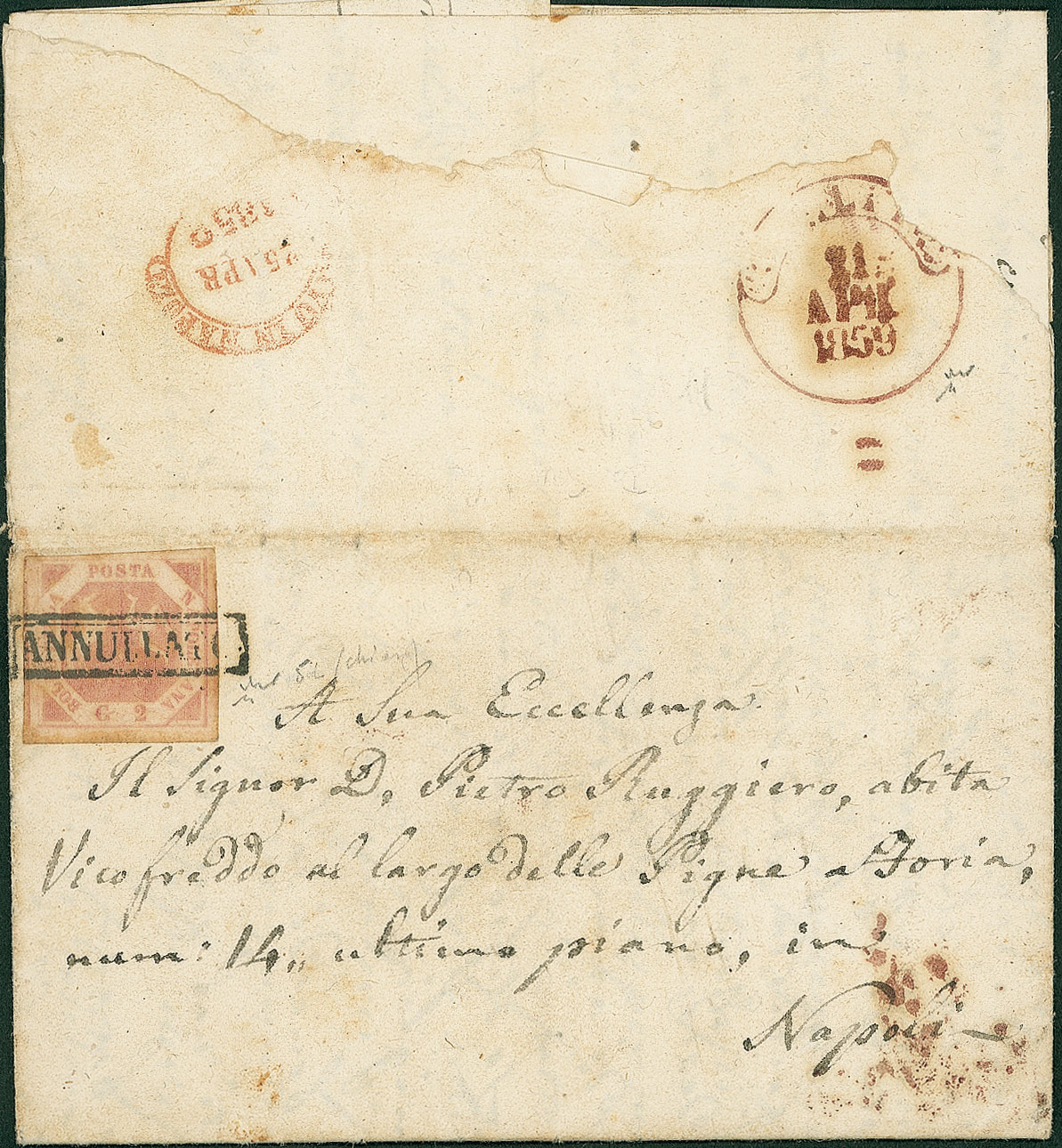 ANTICHI STATI - Napoli - 2 grana - lettera da Melfi (in rosso al retro) a Napoli del 21.4.59 - cert. Chiavarello (5 - punti 11)