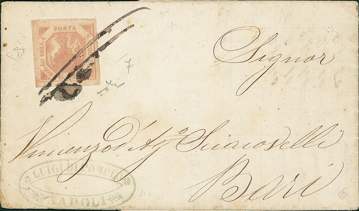 ANTICHI STATI - Napoli - 2 grana - annullato in arrivo con tratti di penna - lettera da Napoli a Bari del 31.5.59 - Diena + cert. Chiavarello (7)