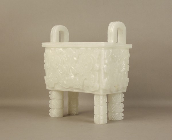 Vaschetta in giada bianca su quattro piedistalli. Cina. XX secolo. Mis. Lung. cm. 21 Alt. cm. 22 Prof. cm. 11 ca.