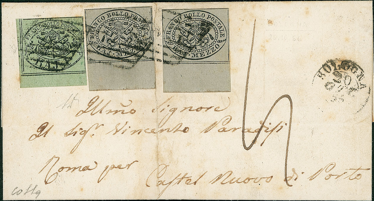 ANTICHI STATI - Pontificio - 1 bai + due 1/2 bai bordo foglio - letterina da Bologna a Roma del 20.10.56 - Diena + Colla (2+1)