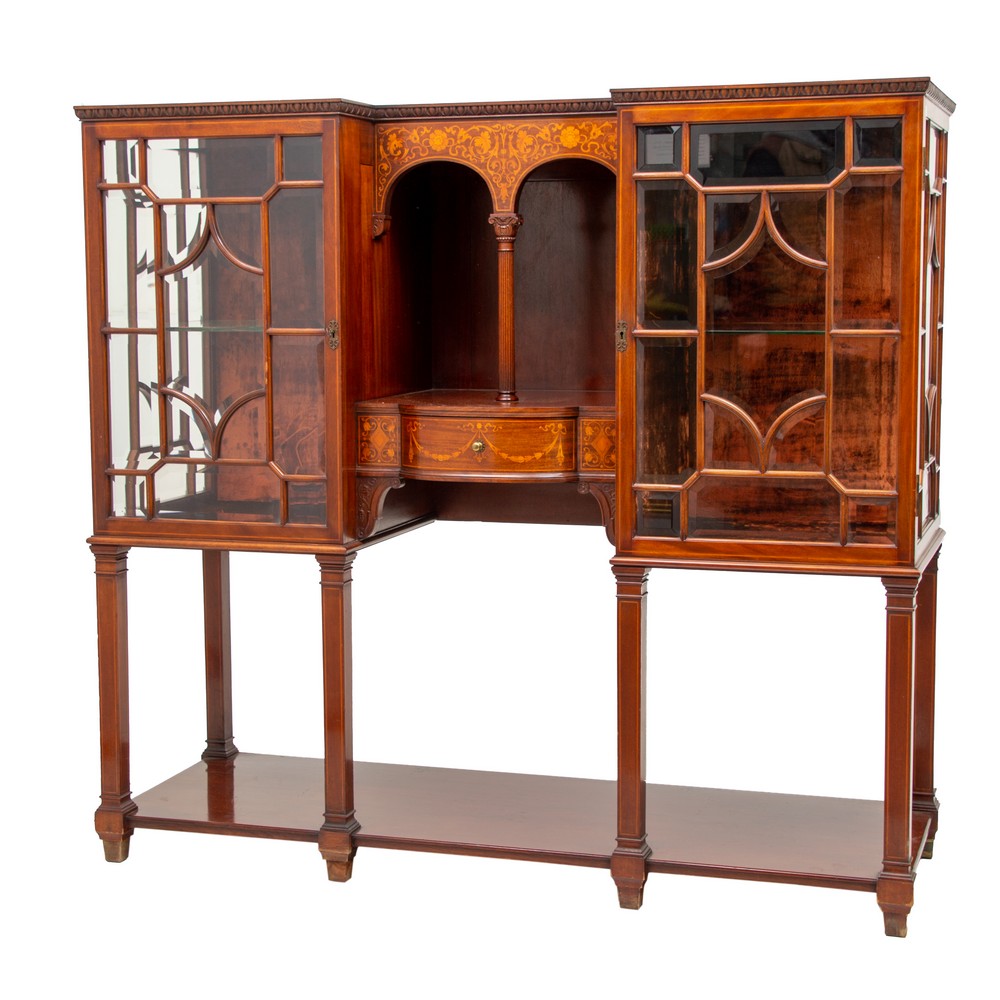 due porte con cassetto centrale, in legno di mogano con tarsie in bosso.