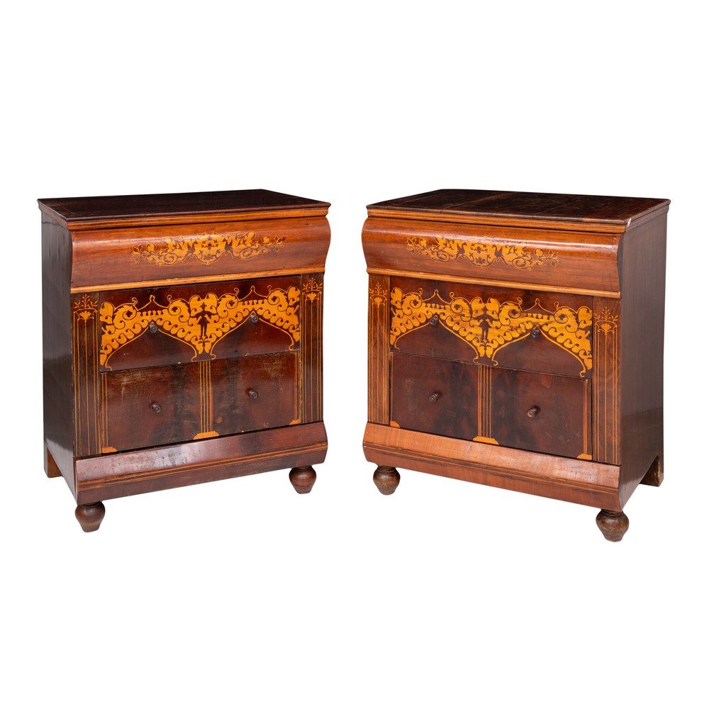 con tre cassetti e finto cassetto nella parte sottostante, in mogano e piuma di mogano con tarsie in bosso