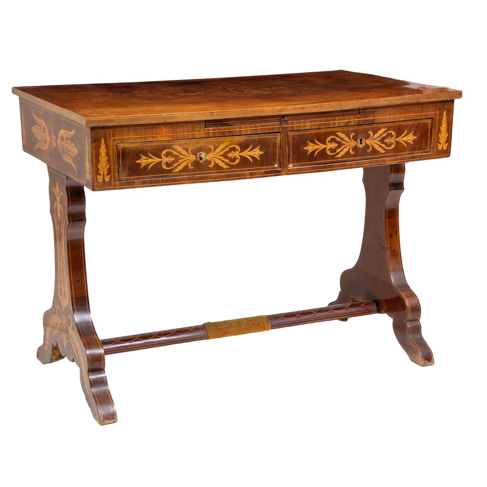 SCRITTOIO Carlo X con due cassetti in mogano e tarsie in legno di bosso.