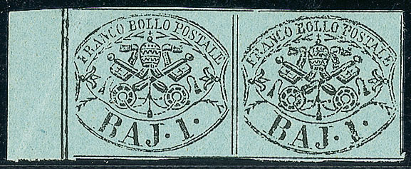ANTICHI STATI - Pontificio - 1852 - 1 bai verde scuro - coppia bordo foglio - gomma integra (2B - 1.100+)
