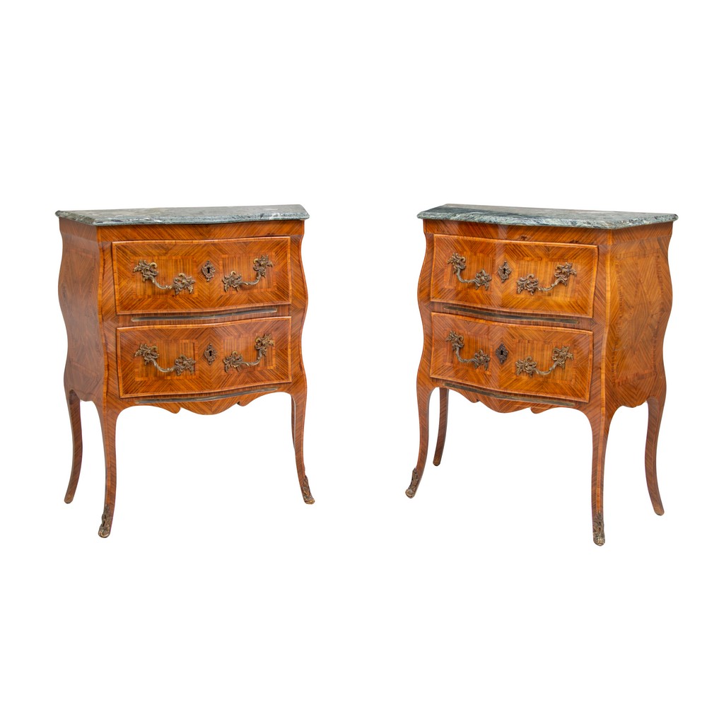 COPPIA COMODINI stile Luigi XV a tre cassetti in legno di ebano e marchetteria in bois de rose, piano in marmo verde delle Alpi.