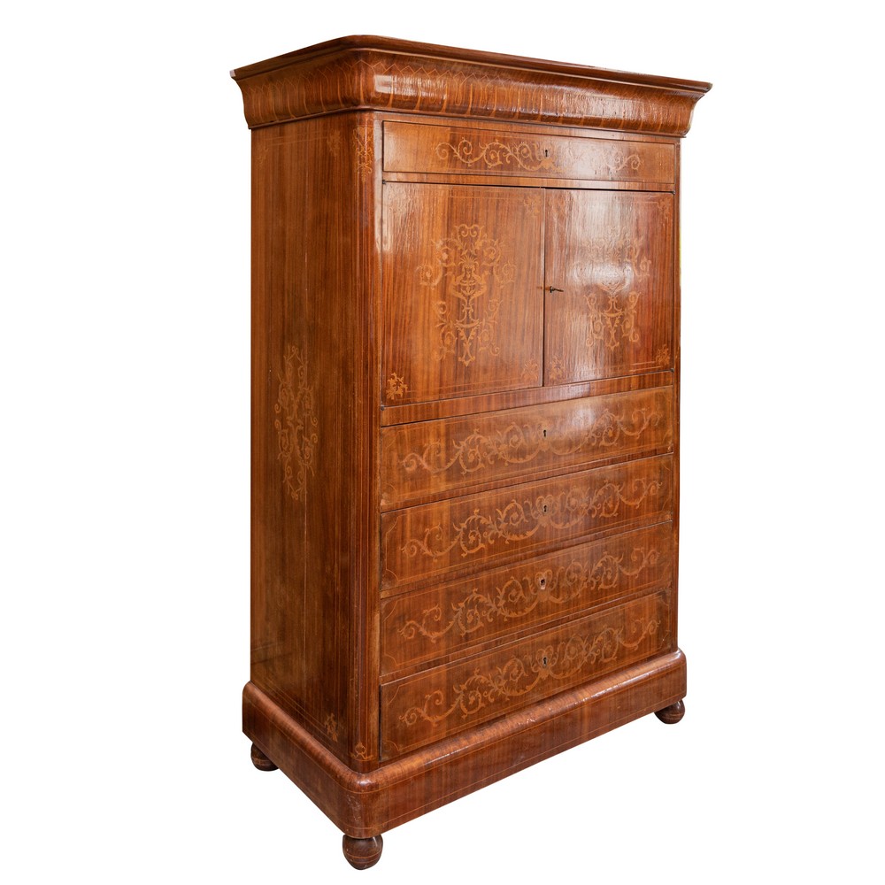 CHIFFONIERE stile Carlo X a cinque cassetti e due ante in mogano e tarsie in bosso.