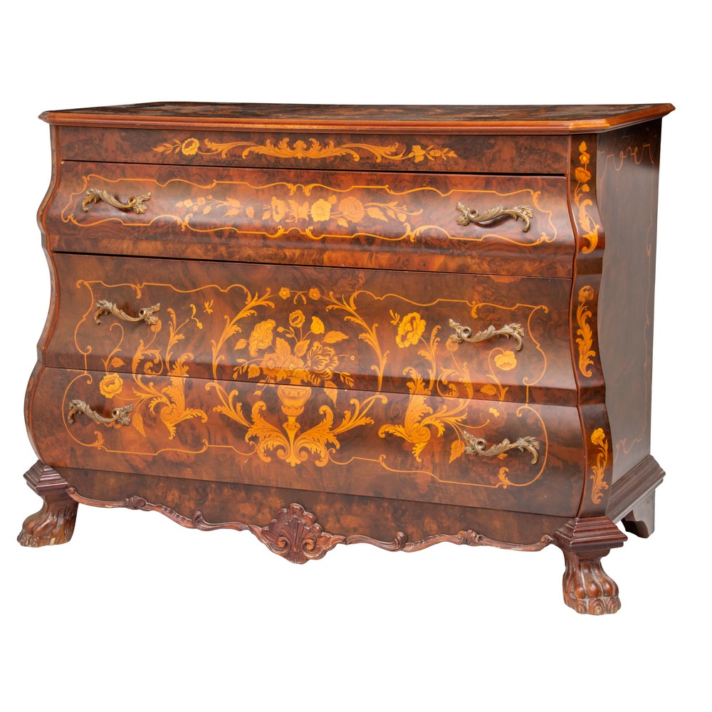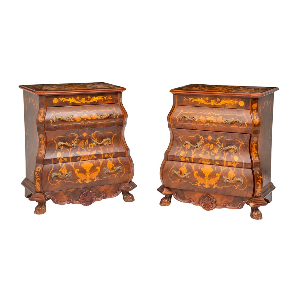 CASSETTONE E DUE COMODINI stile olandese in legno di mogano con tarsie e perfili in bosso.