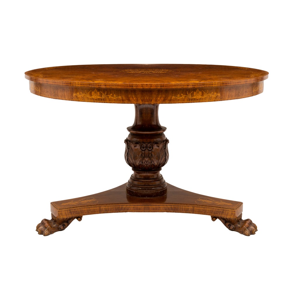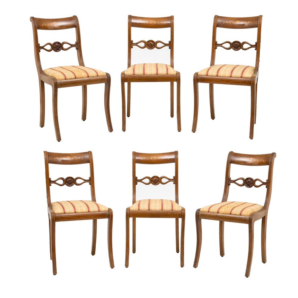 TAVOLO con sei sedie stile Carlo X in palissandro, faggio e tarsie in bosso.