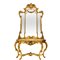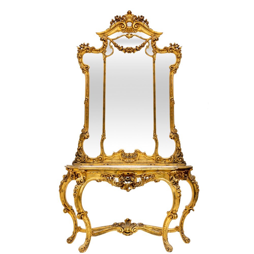 CONSOLLE CON SPECCHIERA di gusto barocco in legno dorato ed intagliato, piano in marmo incassato.