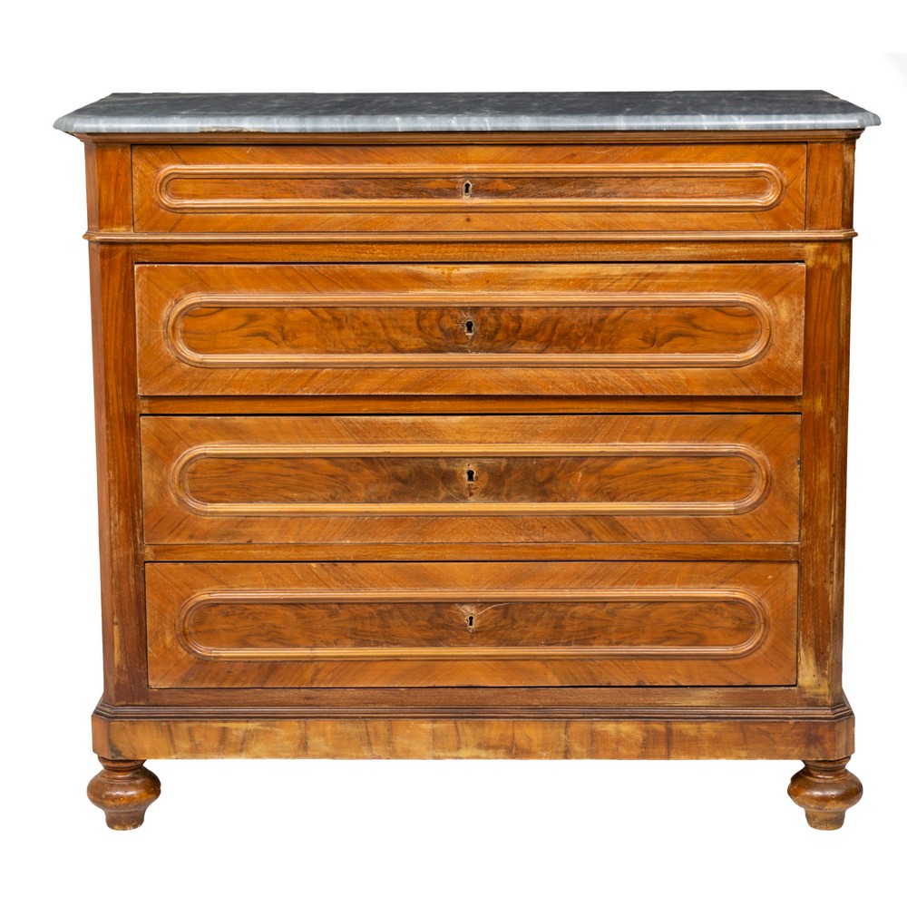 CASSETTONE in legno di noce a quattro cassetti, piano in marmo grigio.