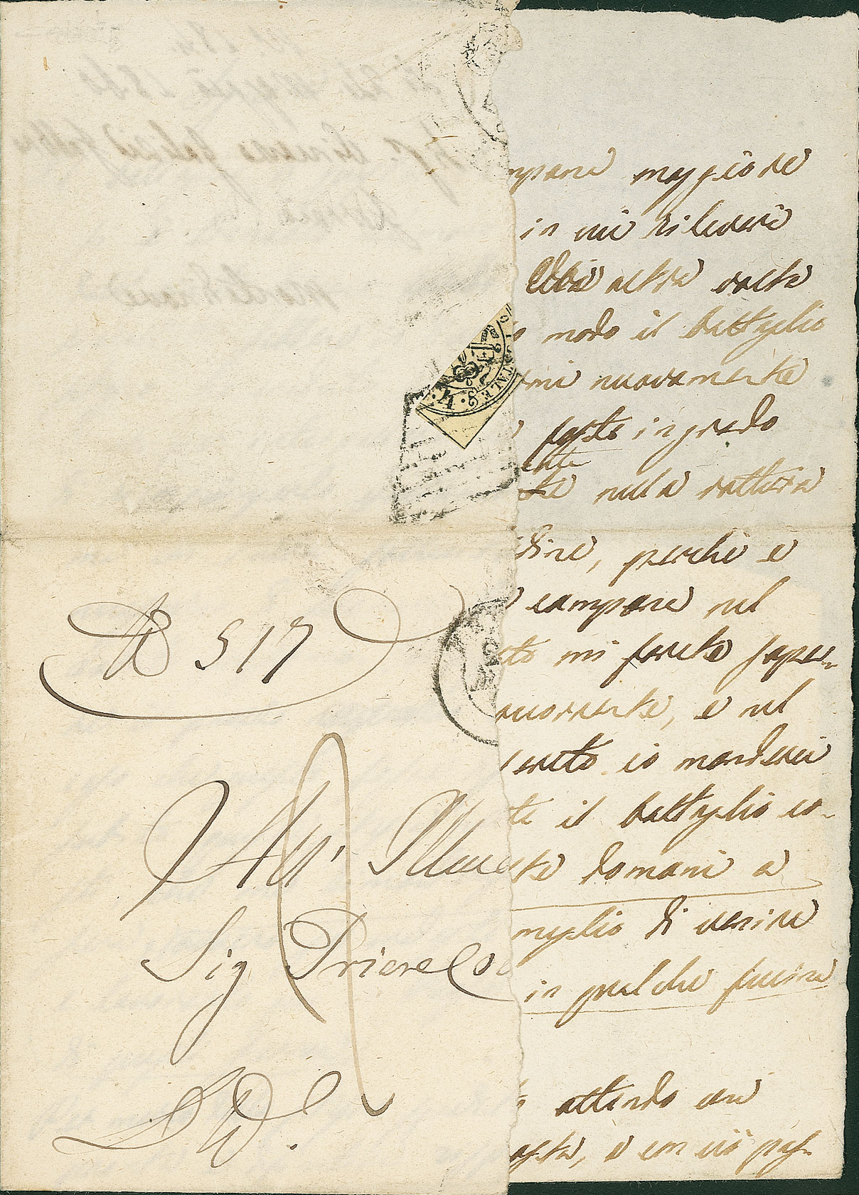 ANTICHI STATI - Pontificio - Frazionato - metà destra di 4 bai applicato a chiudilettera al verso come tassa e strappato in angolo - lettera da Fermo mancante della parte destra - cert. Diena (5A - 6.000)