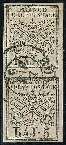 ANTICHI STATI - Pontificio - 1852 - 5 bai - coppia verticale con interspazio al centro (6 - 350)