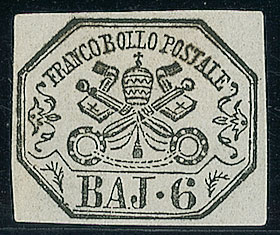 ANTICHI STATI - Pontificio - 1864 - 6 bai grigio perla - decalco oleoso - cert. Colla (7Aa - 2.850)