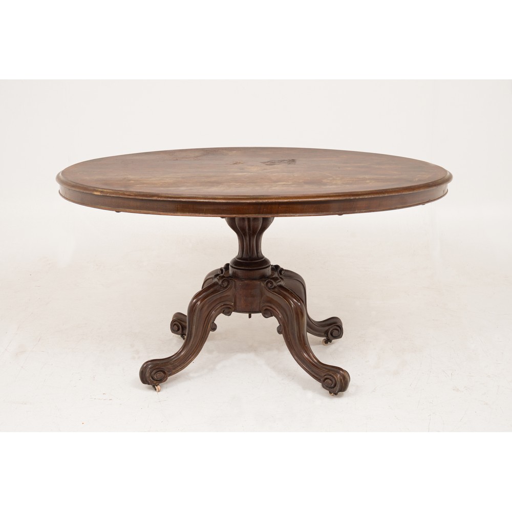 TAVOLO di forma ovale in legno di noce e radica di noce.