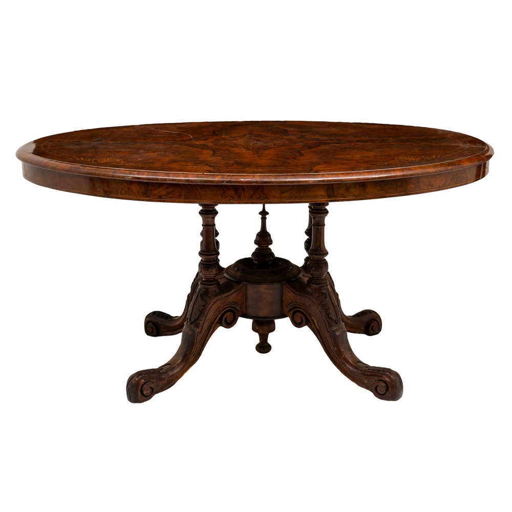 TAVOLINO da salotto di forma ovale in noce e radica di noce, tarsie in bosso.