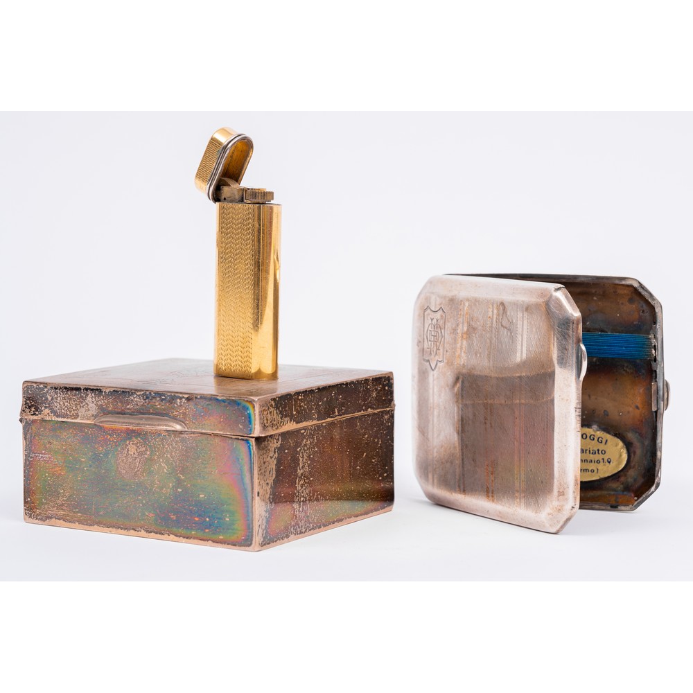 Portasigarette in argento 925 manifattura di Birmingham 1923, scatola in argento sterling e accendino Cartier in metallo dorato (g. 382).