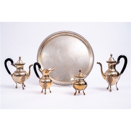 SERVIZIO stile Impero in argento composto da caffettiera, theiera, lattiera e zuccheriera, manici in legno ebanizzato. Argentiere Pampaloni Ermindo - Firenze (g. 1093) e vassoio tondo stile Impero in argento. Argentiere Bonura & Cusimano - Palermo (g. 701).