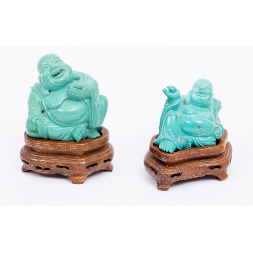 DUE SCULTURINE in turchese raffigurante Buddha con basi in legno.