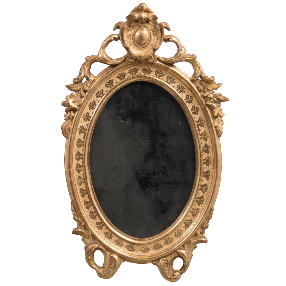 Specchiera in legno dorato finemente scolpita ed incisa con specchio coevo a mercurio.