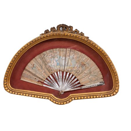 VENTAGLIO dipinto a mano con stecche in madreperla entro ventagliera.