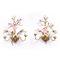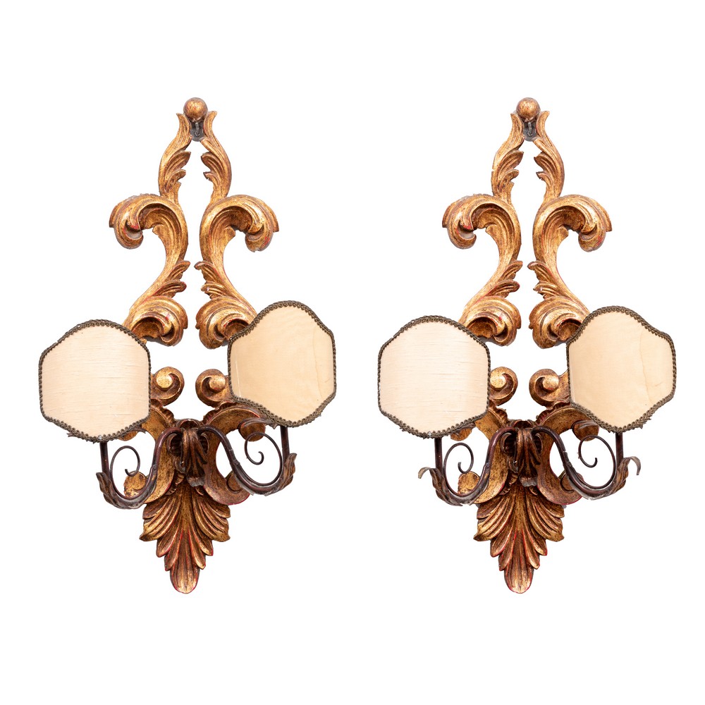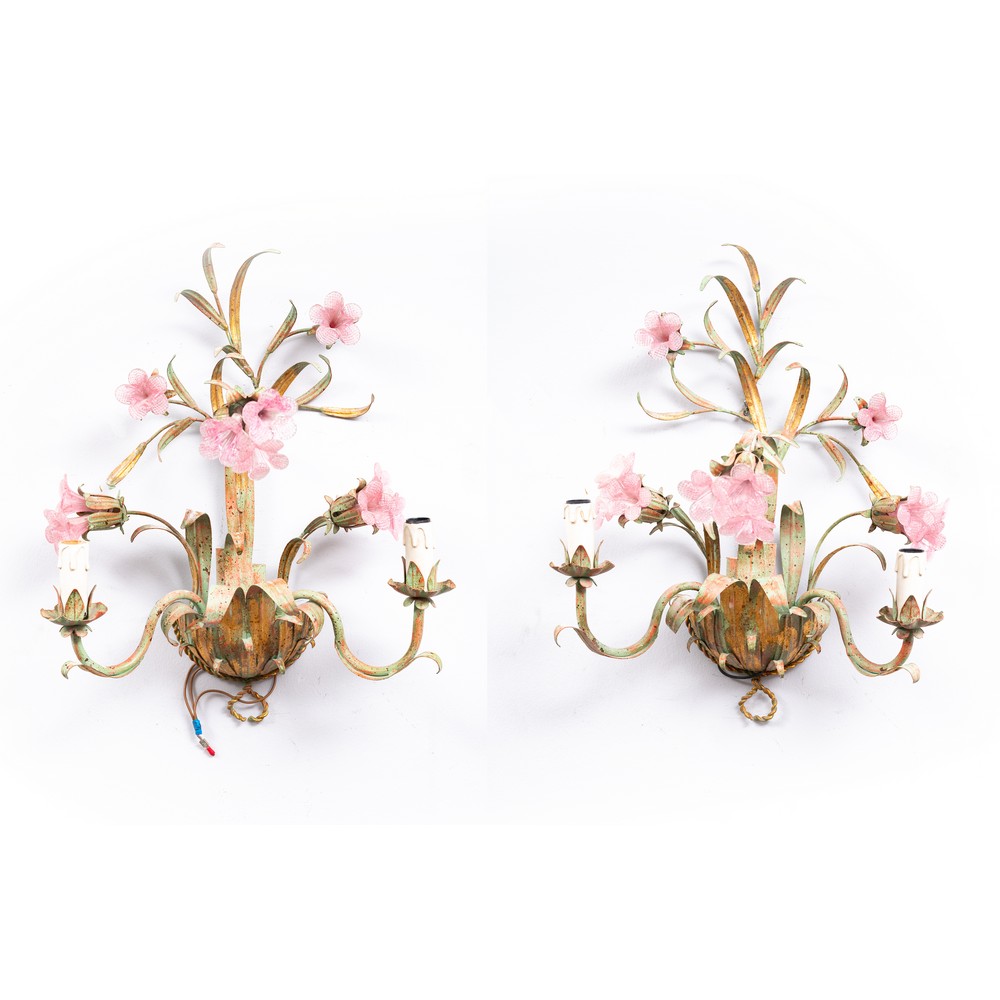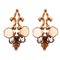 Due applique in ferro dorato a due fiamme e fiori in vetro di Murano e due applique in legno dorato a due fiamme con boccia in ferro.