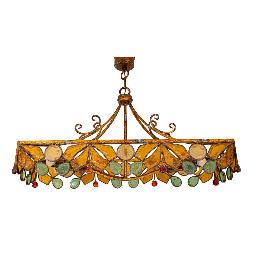 con struttura in ferro dorato e vetri colorati martellati.